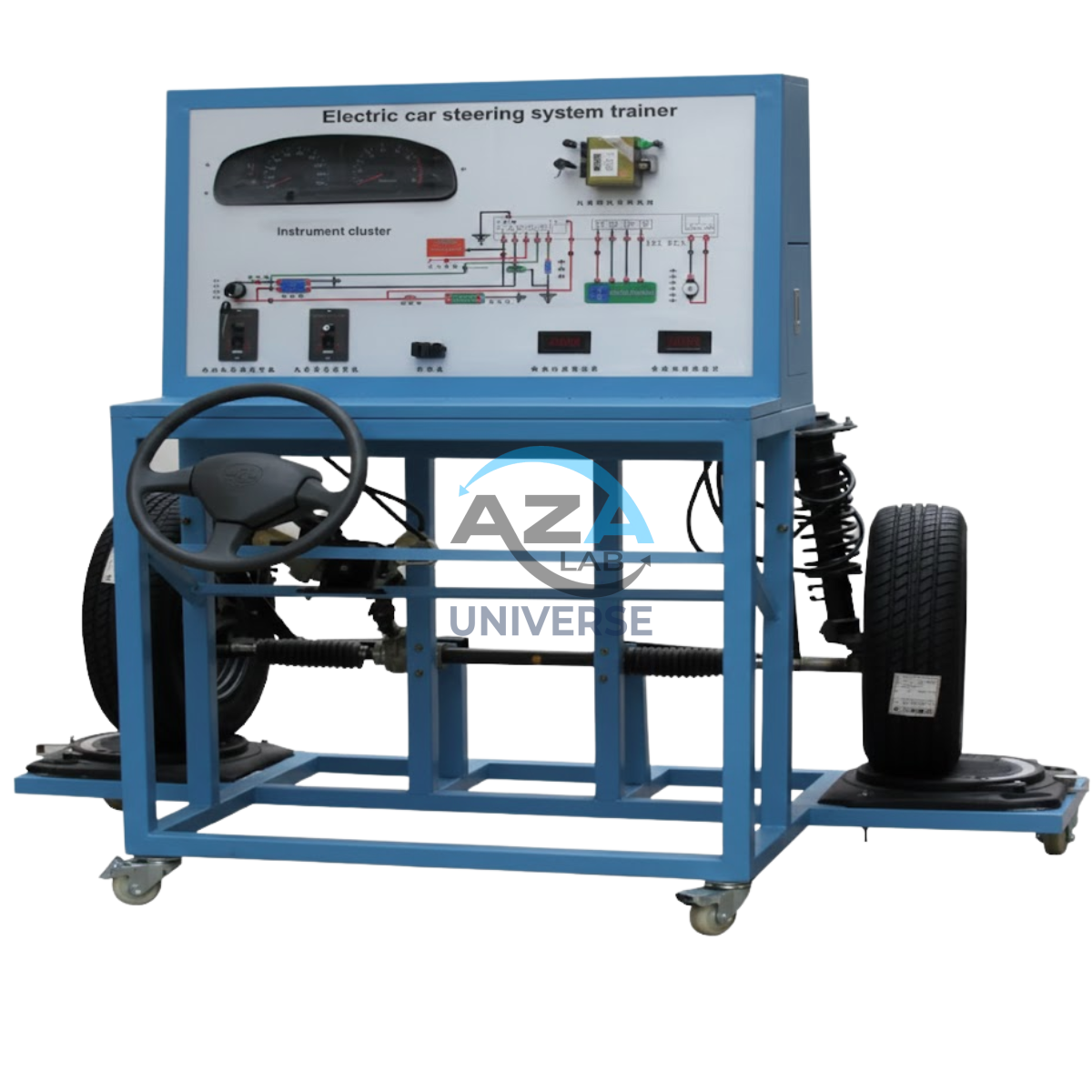 The AZA1248 Car Steering & Suspension System Trainer is an advanced automotive training platform designed to provide complete practical understanding of modern vehicle steering and front suspension systems. Developed using real automotive components and mounted on a robust mobile steel structure, this trainer enables students and technicians to gain hands-on experience in inspection, diagnosis, adjustment, and repair of steering and suspension assemblies commonly used in passenger vehicles.